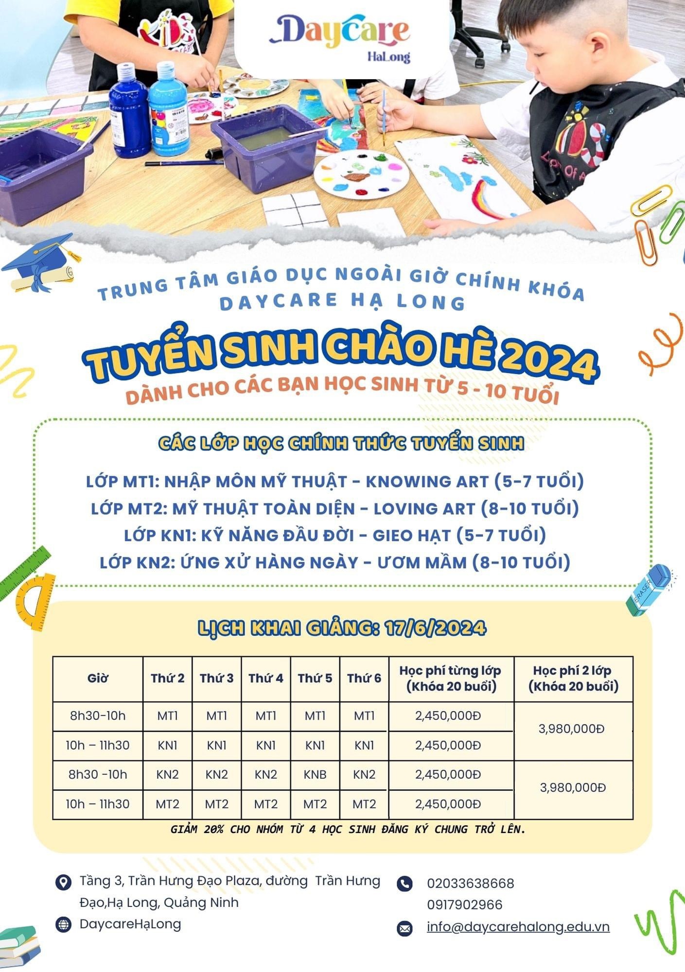 Trung tâm giáo dục ngoài giờ chính khóa Daycare Hạ Long thông báo tuyển sinh chương trình Chào Hè 2024, dành cho các bạn học sinh từ 5 – 10 tuổi:
